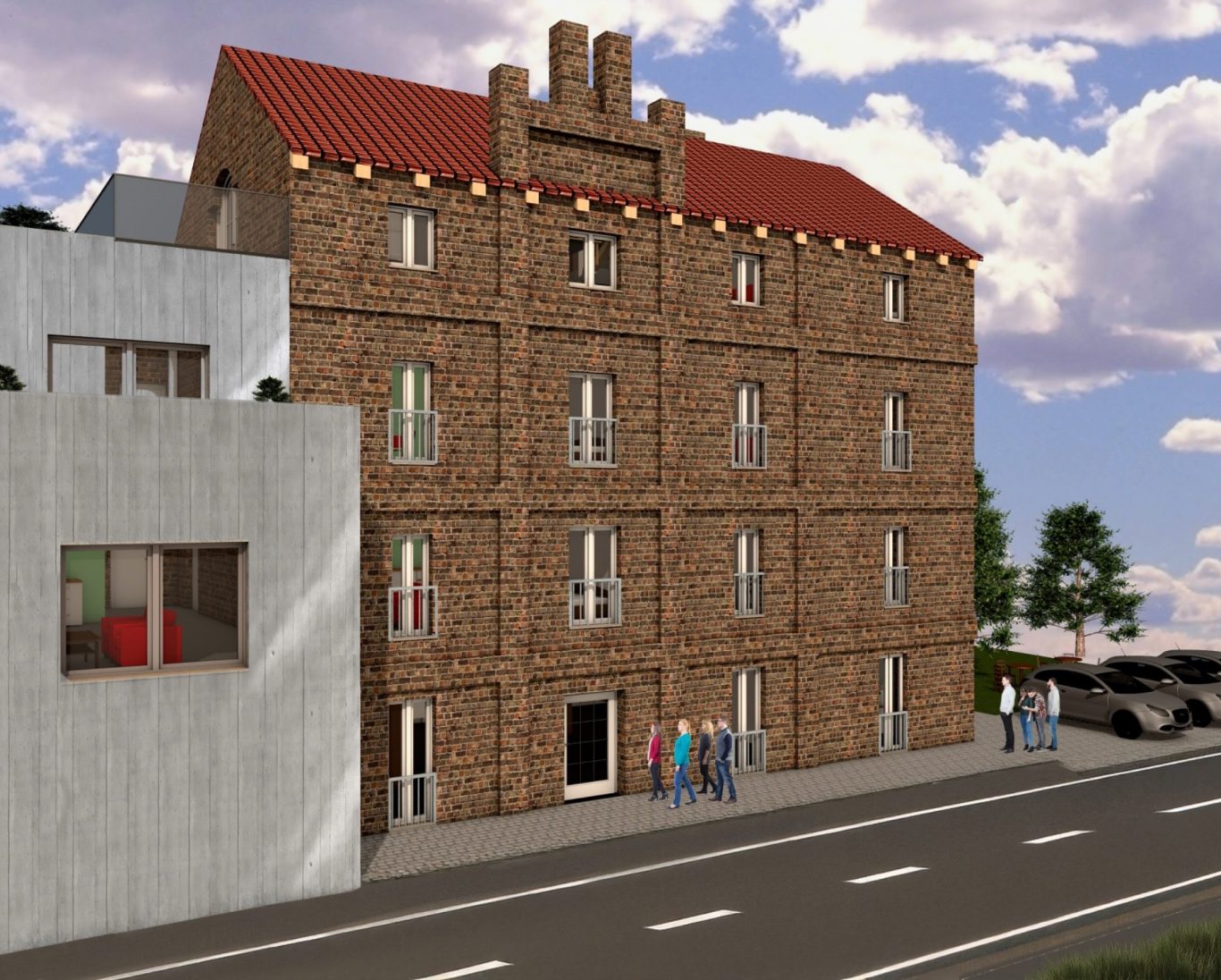 Die ehemalige Industriemühle, ein viergeschossiges Backsteingebäude, wird komplett zu einem Apartmenthotel und Restaurant aus- und umgebaut.